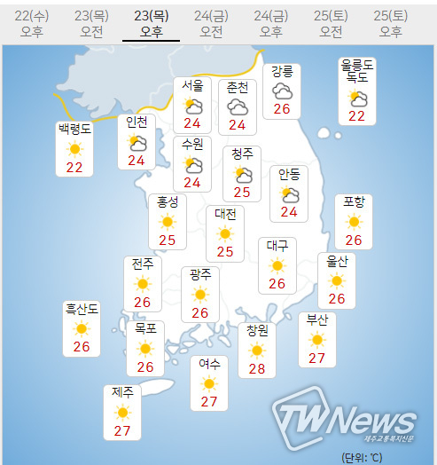 (23일) 아침최저기온은 서울 17도, 인천 19도, 수원 17도 등 13~19도, 낮최고기온은 서울 24도, 인천 24도, 수원 24도 등 23~25도가 되겠다.