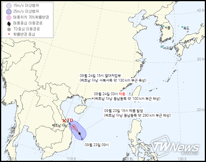 24일 15시 베트남 다낭 서북서쪽 약 130km부근육상에서 열대저압부로 약화 될 예정이다.