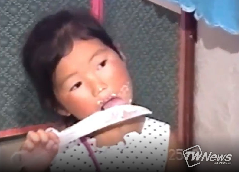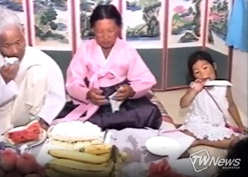동영상에는 91년 7월25일 날짜가 찍힌 가운데 어린시절 송가인이 케이크 커팅용 칼에 묻은 생크림을 먹고 있는 귀여운 모습이 고스란히 찍혀있다.