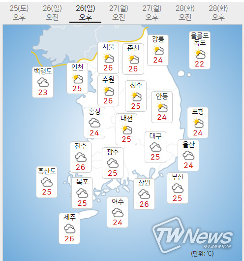 내일(26일) 아침 기온은 14~20도로 오늘(25일, 14~22도)과 비슷하거나 조금 낮겠고, 일부 강원내륙과 산지에는 10도 내외로 떨어지는 곳이 있어 쌀쌀하겠다.