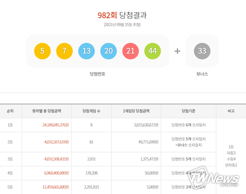 [제주교통복지신문 최효열 기자] 982회 로또 1등당첨번호조회는 " 44, 7, 21, 5, 13, 20 "이다. 2등 보너스번호는 " 33 "이다.