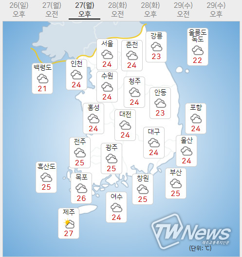 (27일) 아침최저기온은 서울 18도, 인천 19도, 수원 18도 등 14~19도, 낮최고기온은 서울 24도, 인천 24도, 수원 24도 등 23~25도가 되겠다.