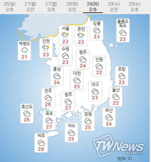 (28일) 아침최저기온은 서울 18도, 인천 19도, 수원 18도 등 14~19도, 낮최고기온은 서울 23도, 인천 23도, 수원 23도 등 21~24도가 되겠다.