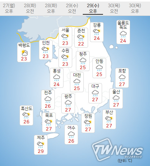 (29일) 아침최저기온은 서울 20도, 인천 21도, 수원 20도 등 17~21도, 낮최고기온은 서울 23도, 인천 23도, 수원 24도 등 22~24도가 되겠다.