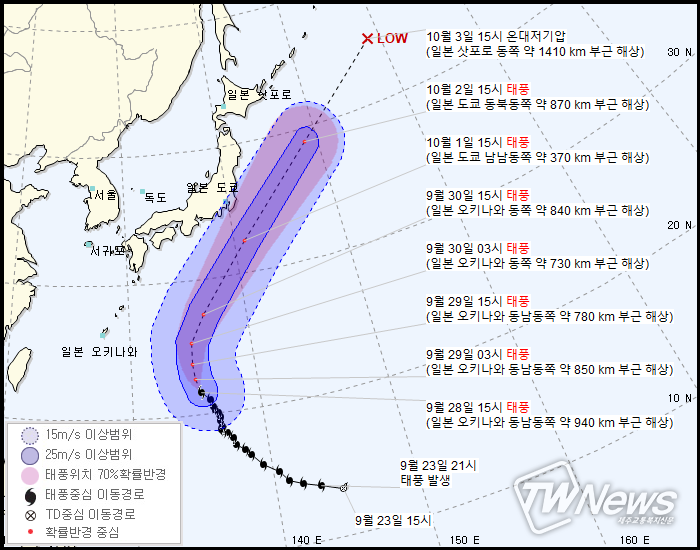 10월3일 15시 일본 삿포로 동쪽 약 1410km부근해상
