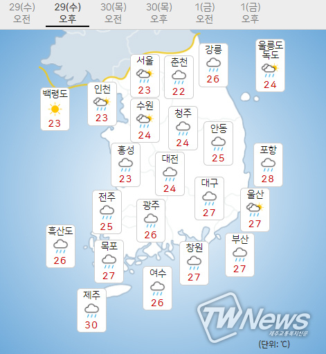 29일 수요일 오늘날씨는 다음과 같다.