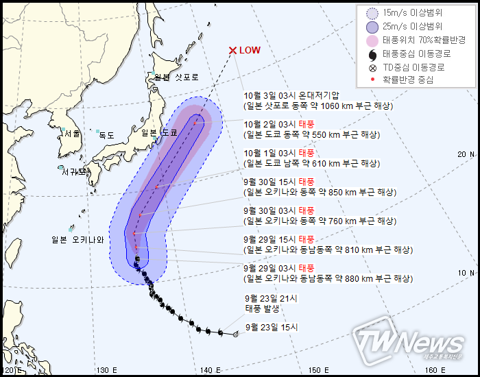 10월1일 일본 도쿄를 지나 3일쯤 삿포로 동쪽 약 1060km부근해상에서 온대저기압으로 약화될 예정이다.