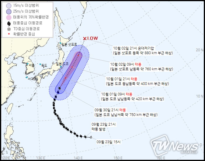 10월2일 21시 일본 삿포로 동쪽 약880km부근해상에서 온대저기압으로 약화될 예정이다.
