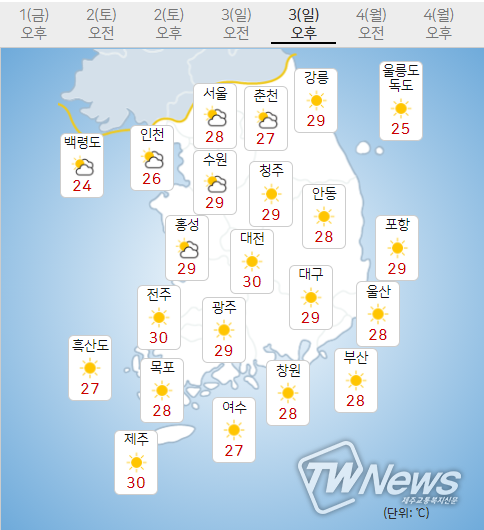 모레(3일) 아침최저기온은 20~21도(평년 17~19도), 낮최고기온은 28~30도(평년 24~26도)가 되겠다.