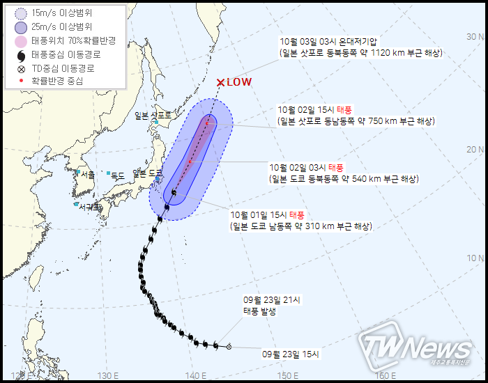 3일 03시 일본 삿포로 동북동족 약 1120km부근해상