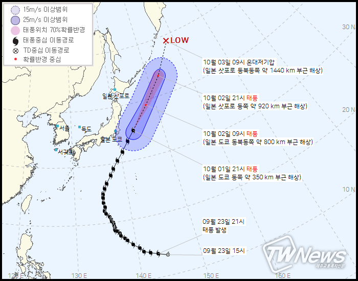 3일 09시 일본 삿포로 동북동쪽 약 1440km부근해상에서 온대저기압으로 약화될 예정이다.