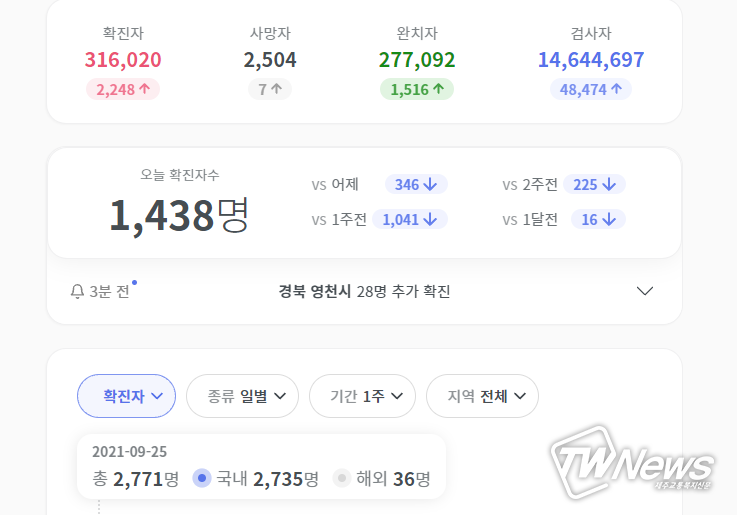 코로나라이브 실시간확진자수 현황은 2일 오후 19시20분 현재 1438명을 기록하고 있다.