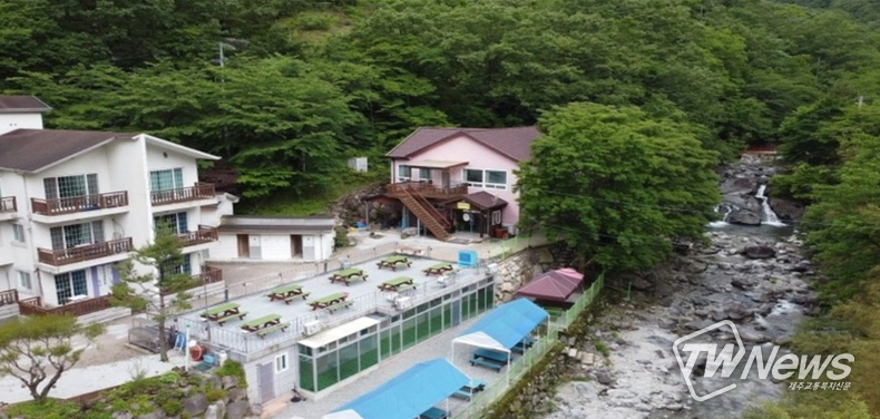 지리산 한 달 살기 펜션으로 장기숙박이 가능하며 자체 식당과 노래방, 계곡 앞 평상·테이블, 방갈로, 노래방, 수영장 등이 갖춰져 있다.
