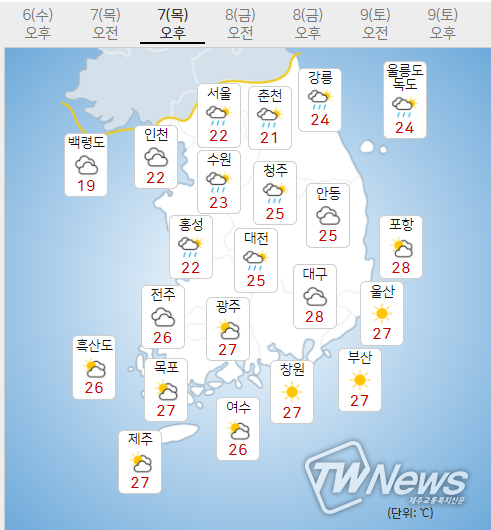 (7일) 아침최저기온은 20~21도(평년 16~18도), 낮최고기온은 27도 내외(평년 23~25도)가 되겠다.