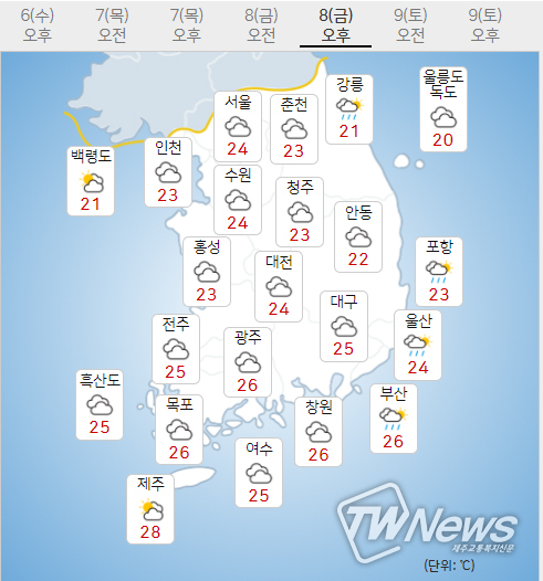 (8일)까지 기온은 (6일, 아침최저기온 21~23도, 낮최고기온 28~29도)보다 조금 낮겠다.
