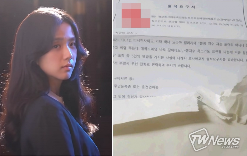 공개된 출석요구서 사진에는 글쓴이가 ‘블핑 지수 쟤는 XXX 아니냐’, ‘매XX마냥 바로 갈아타X’, ‘X지수 목소리도 XXX 나는데’ 등 악성 댓글을 작성했던 내용이 담겼다.
