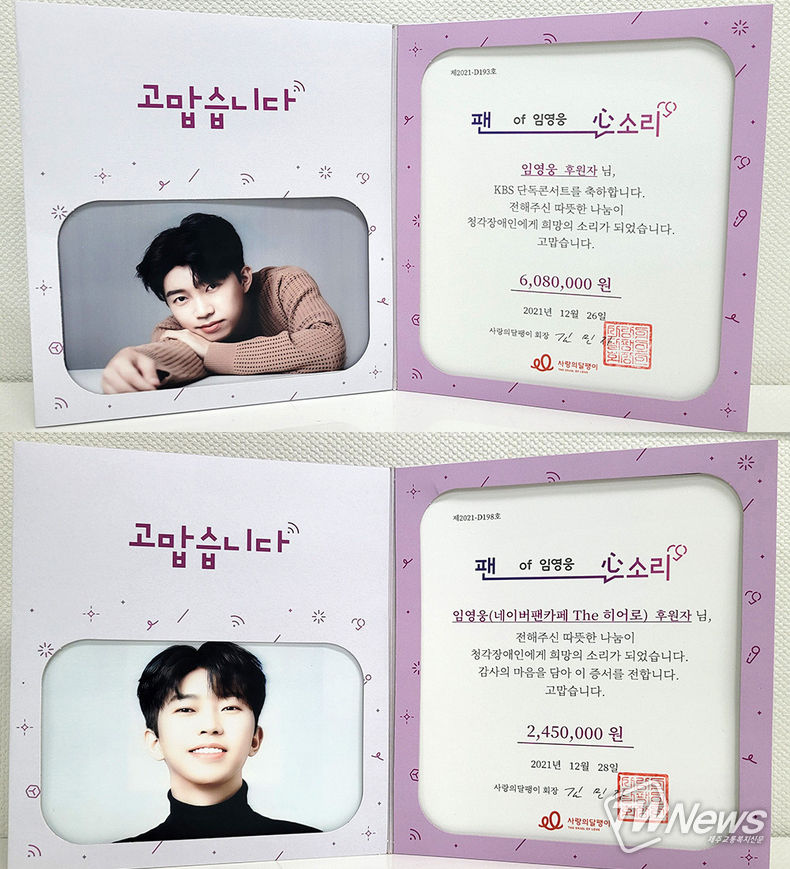 임영웅의 팬클럽은 지난 26일 방송된 임영웅의 KBS 단독 콘서트를 기념해 특별한 선물을 전달하고자 회원들 자발적으로 기부금을 모아 사랑의달팽이에 전달했다. 임영웅 팬클럽 ‘웅바라기스쿨’에서 608만 원, ‘임영웅네이버팬카페The히어로’에서 245만 원을 기부했다.