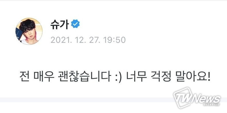 27일 슈가는 팬 커뮤니티를 통해 “전 매우 괜찮습니다. 너무 걱정 말아요!”라는 짧은 안부 인사를 남겼다.