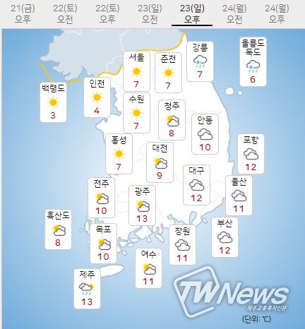 (23일)까지 기온은 (21일, 아침최저기온 0~3도, 낮최고기온 10~11도)보다 높겠다.