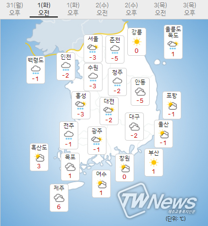(2월 1일) 아침최저기온은 서울 -3도, 인천 -2도, 수원 -3도 등 -7~-1도, 낮최고기온은 서울 3도, 인천 2도, 수원 3도 등 2~4도가 되겠다.
