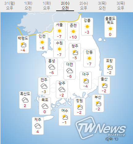(2월 2일) 아침최저기온은 -10~-4도, 낮최고기온은 0~3도가 되겠다.