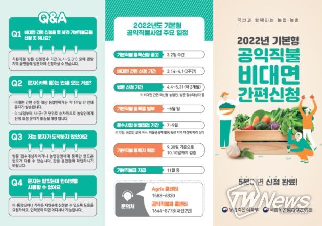 지난해 기본 직불등록 정보의 변경이 없는 농업인은 사전 문자 안내를 통해 3월 14일부터 4월 1일까지 비대면 간편 신청을 하면 된다.