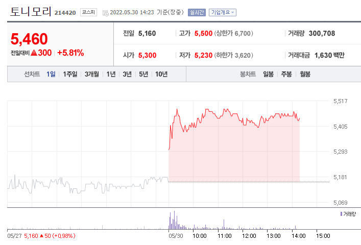30일 오후 2시 25분 기준 토니모리의 주가는 전 거래일 대비 5.81%(300원) 상승한 5460원에 거래되고 있다.