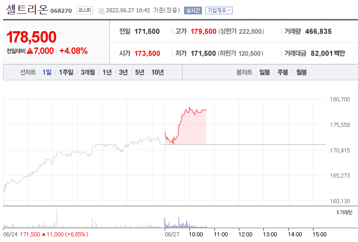 27일 오전 10시 42분 기준 셀트리온 주가는 전 거래일 대비 4.08%(7000원) 상승한 17만8500원에 거래되고 있다.