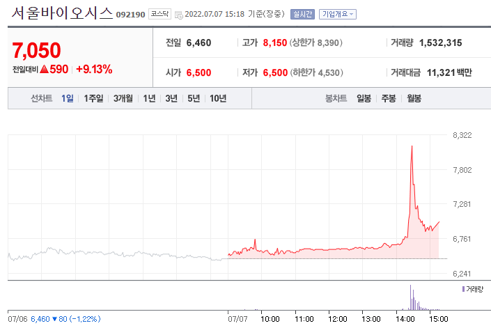 7일 오후 3시 18분 기준 서울바이오시스 주가는 전 거래일 대비 9.13%(590원) 상승한 7050원에 거래되고 있다.