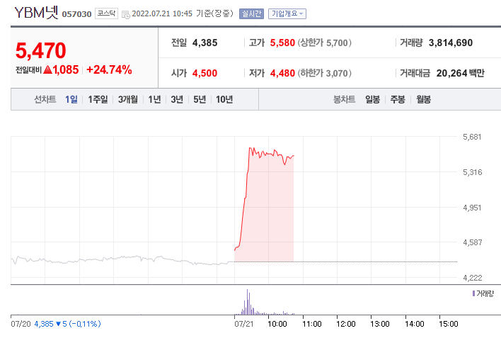 21일 오전 10시 45분 기준 YBM넷 주가는 전 거래일 대비 24.74%(1085원) 상승한 5470원에 거래되고 있다.