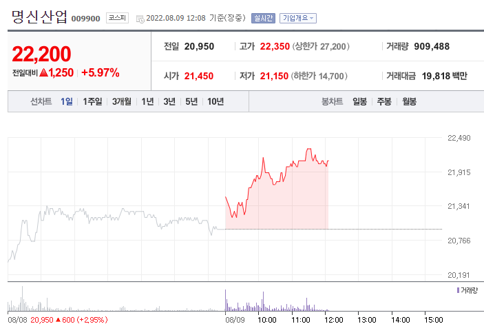 9일 오후 12시 8분 기준 명신산업 주가는 전 거래일 대비 5.97%(1250원) 상승한 2만2200원에 거래되고 있다.