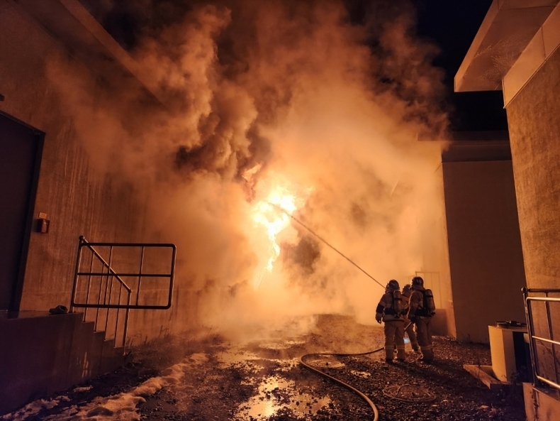 28일 전남소방본부 등에 따르면 지난 27일 오후 4시 28분쯤 전남 영암군 금정면의 한 태양광 발전소 에너지저장장치(ESS) 보관 시설 1개 동에서 불이 나 창고 안에 있던 저장장치 배터리 8백여 개가 불에 탔다.