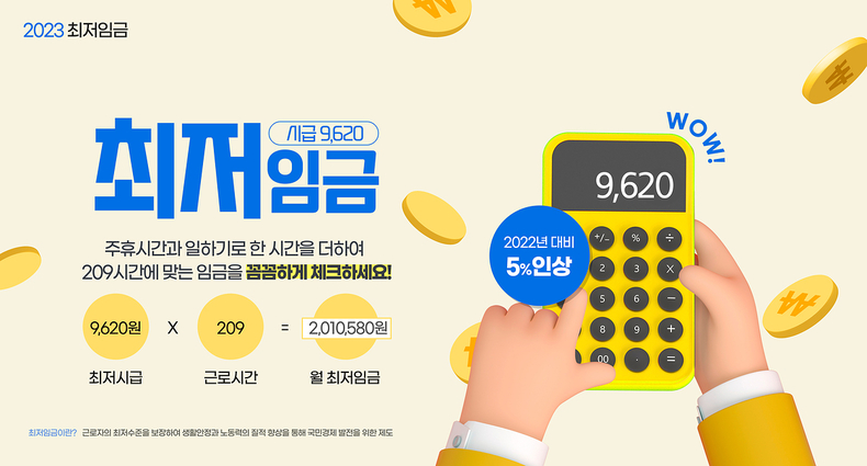 2023년 최저시급은 9620원으로 월급으로 계산 시 201만580원이다. 2022년 대비 5% 인상된 금액이다.