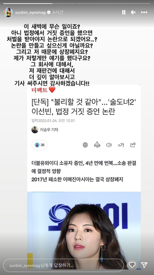 이선빈은 4일 오전 자신의 인스타그램 스토리에 "이 새벽에 무슨 일이죠? 아니 법정에서 거짓 증언을 했으면 처벌을 받아야지 논란으로 되겠어요?"라며 장문의 글을 게재했다.