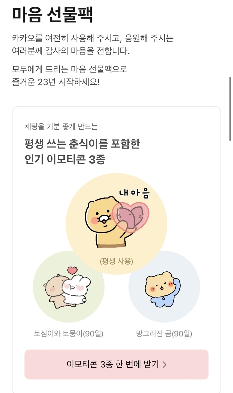 카카오가 이날 오전 9시부터 ‘카카오 전 국민 마음 패키지’로 일반 이용자 4800만명에 이모티콘 3종(영구 이용 1종, 90일 이용 2종)을 지급하고 있다.