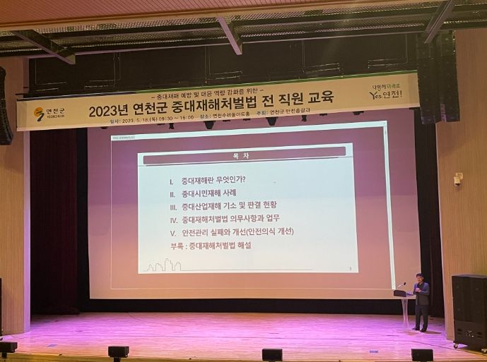 이날 교육은 안전 분야 전문가 김정곤 (사)방재관리연구센터 연구실장의 강의로 연천군 전 직원 및 도급ˑ용역ˑ위탁 업체 등 800여 명을 대상으로 2회에 걸쳐 △중대재해처벌법의 주요 내용 △중대재해 사례 △안전보건관리의 필요성 △체계적인 안전보건관리 방안 등의 내용으로 진행됐다.