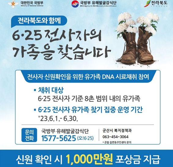 [제주교통복지신문 김강석 기자] 오는 6월 호국보훈의 달을 맞아 전라북도 35사단, 군산시 및 이·통장단 등 민간단체가 협업해 '6.25 전사자 유가족 집중찾기'를 6월 한달간 진행한다.