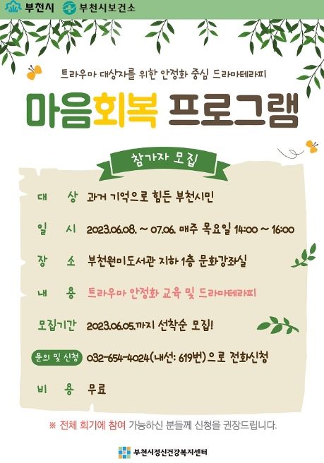 조용익 부천시장은 “이번 마음 회복 프로그램을 통해 과거 기억으로 힘든 시간을 보내고 있는 부천시민들의 심리회복과 정신건강 증진을 기대한다. 많은 참여와 관심을 바란다”고 전했다.