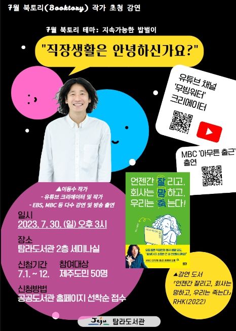 [제주교통복지신문 김지홍 기자] 제주시 탐라도서관은 7월 30일 오후 3시 이동수의 작가의 강연 ‘직장생활은 안녕하신가요?’를 개최한다