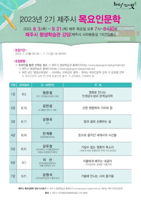[제주교통복지신문 김현석 기자] 제주시는 시민들의 인문학적 소양을 갖추기 위한 『2023년 2기 제주시 목요인문학 강좌』수강생을 모집한다.