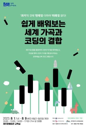 기술입은문화예술교육 '쉽게 배워보는 세계 가곡과 코딩의 결합'은 8월 1~9일 제주문예회관 교육실에서 진행될 예정이며, 문예회관의 기반시설과 제주 특산품을 활용해 나만의 악기를 제작하고 코딩을 통해 새로운 가곡을 재탄생시켜 예술과 기술의 경계를 넘어선 창의적인 경험을 할 수 있다.
