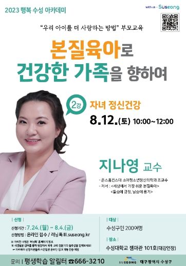 한편, 수성구는 오는 22일부터 11월 4일까지 총 6회에 걸쳐 수성구민 200여 명을 대상으로 육아·교육 관련 전문가와 함께 매주 토요일 오전 10시에‘2023 행복 수성 아카데미’를 운영한다.