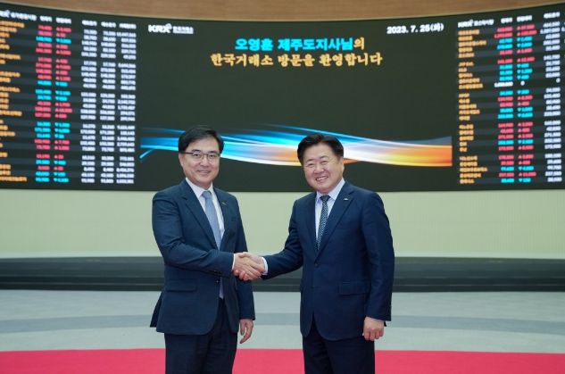 오영훈 지사는 25일 오후 4시 서울 여의도 한국거래소(서울 여의도점)를 방문해 제주지역의 우수한 기업이 상장을 이룰 수 있도록 제주도와 한국거래소 간 지속적으로 협력을 다져나갈 것을 요청했다.