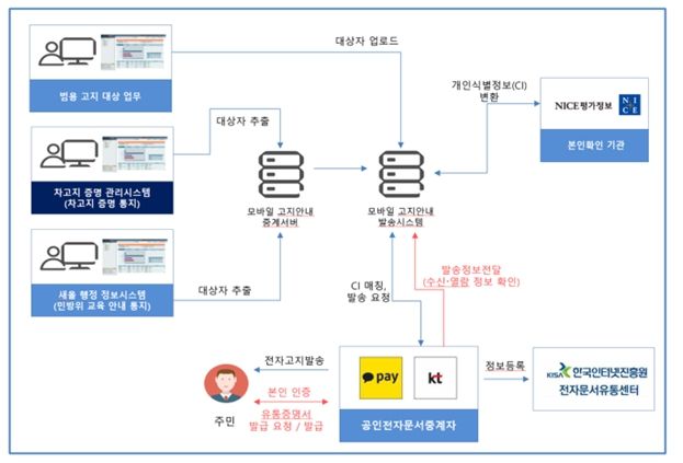 모바일 고지는 개인정보를 취급하는 만큼 개인정보보호를 위해 과학기술정보통신부로부터 허가를 받은 공인전자문서 중계자를 통해 개인 모바일 기기로 발송하고 본인인증 절차를 거치면 언제 어디서나 모바일 기기에서 열람이 가능하다.