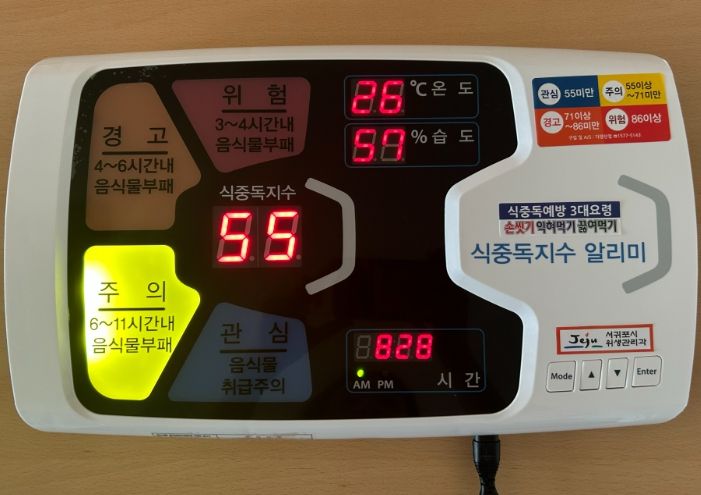 뿐만 아니라 온도·습도를 감지하여 식중독 단계별(관심, 주의, 경고, 위험) 지수를 표시하는‘식중독지수 알리미’를 배부하여 식중독에 대한 경각심을 고취한다.