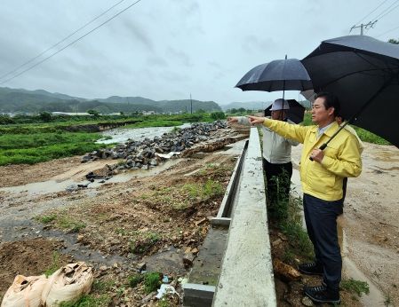 이에 현장을 직접 방문한 신영재 군수는 관내 군도 4호선 북방면 원소리 540-2번지 일원 벌업지구 선형개량공사, 북방면 구만리 894-325번지 일원 자연재해위험개선지구 정비사업 등 태풍 피해 예방과 대응 상황을 점검하기 위해 주요 건설현장을 찾았다.