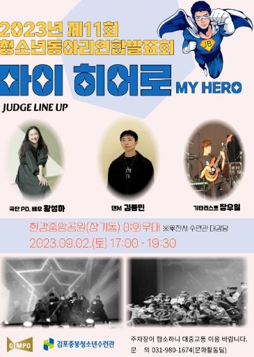 [제주교통복지신문 김강석 기자] 김포시청소년재단 김포중봉청소년수련관이 주관하는 제11회 청소년동아리연합발표회 ‘마이히어로’ 가 2023년 9월 2일 17:00에 장기동 한강중앙공원 야외무대에서 개최된다고 밝혔다.