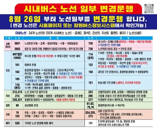 [제주교통복지신문 김강석 기자] 창원특례시는 오는 8월 26일부터 시내버스 일부노선을 변경 운행한다고 밝혔다.