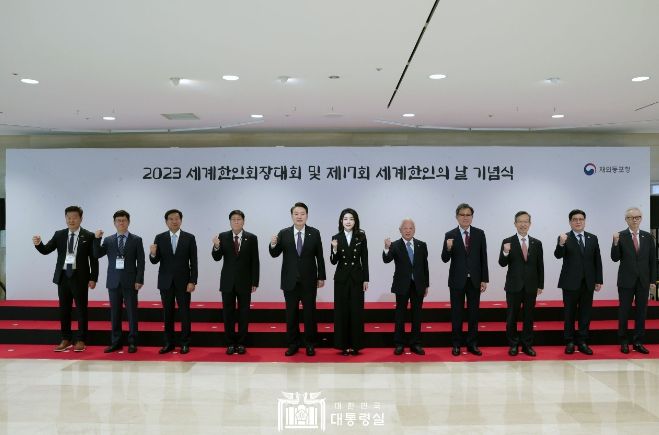 이날 기념식에는 대통령 부부를 비롯해 박진 외교부 장관, 이기철 재외동포청장, 김석기 국민의힘 재외동포위원장, 태영호 국민의힘 의원, 조태용 국가안보실장, 김태효 국가안보실 제1차장 등 국내 주요 인사와 세계 각국 한인회장 350여 명이 참석했다. ‘세계 한인의 날’인 10월 5일을 맞아 열린 이날 기념식은 지난 6월 재외동포청이 출범한 이후 첫 번째로 열린 행사라는 점에서 의미를 더했다.