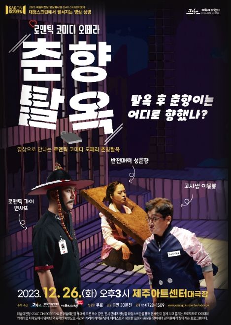 [제주교통복지신문 김지홍 기자] 제주아트센터는 12월 26일 오후 3시, 싹 온 스크린 마지막 작품으로 유쾌 발랄 로맨틱 코미디 창작오페라 '춘향탈옥'을 영상으로 선보인다.